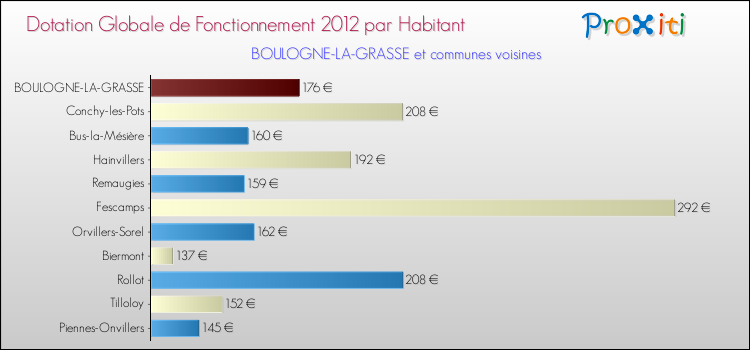 Le graphique ci dessous indique la Dotation Globale de Fonctionnement accordée par habitant à Boulogne-la-Grasse en 2012 par rapport aux communes voisines.