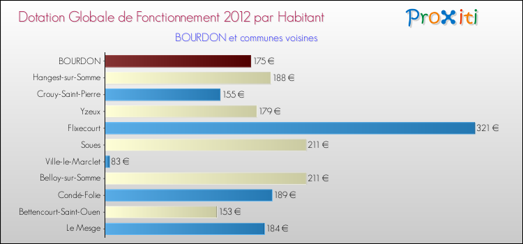 Le graphique ci dessous indique la Dotation Globale de Fonctionnement accordée par habitant à Bourdon en 2012 par rapport aux communes voisines.