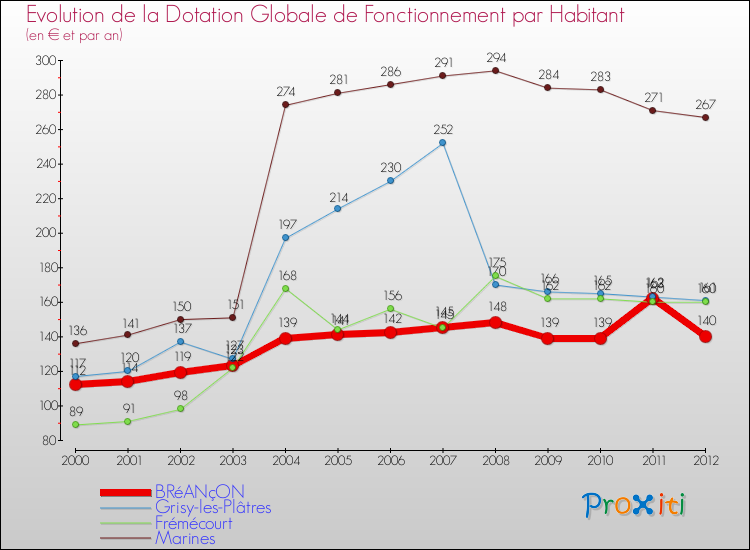 Dans le même temps, la Dotation Globale de Fonctionnement accordée aux communes françaises similaires à Bréançon était de 200 € par habitant, en 2012.