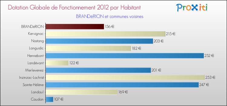 Le graphique ci dessous indique la Dotation Globale de Fonctionnement accordée par habitant à Brandérion en 2012 par rapport aux communes voisines.