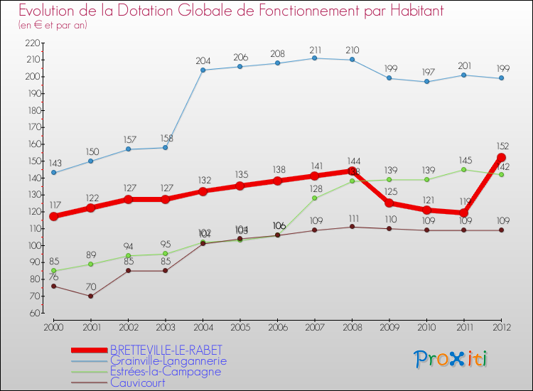 Dans le même temps, la Dotation Globale de Fonctionnement accordée aux communes françaises similaires à Bretteville-le-Rabet était de 200 € par habitant, en 2012.