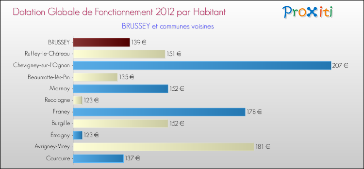 Le graphique ci dessous indique la Dotation Globale de Fonctionnement accordée par habitant à Brussey en 2012 par rapport aux communes voisines.
