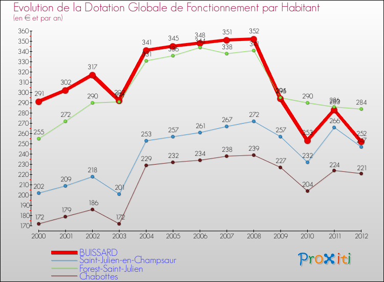Dans le même temps, la Dotation Globale de Fonctionnement accordée aux communes françaises similaires à Buissard était de 232 € par habitant, en 2012.
