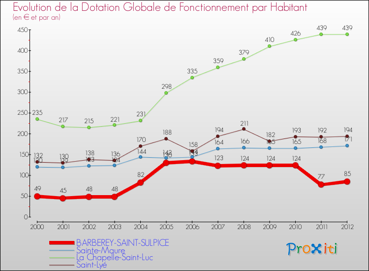 Le graphique ci dessous indique la Dotation Globale de Fonctionnement accordée par habitant à Barberey-Saint-Sulpice en 2012 par rapport aux communes voisines.