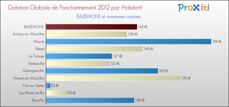 Le graphique ci dessous indique la Dotation Globale de Fonctionnement accordée par habitant à Bazemont en 2012 par rapport aux communes voisines.