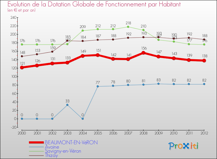Dans le même temps, la Dotation Globale de Fonctionnement accordée aux communes françaises similaires à Beaumont-en-Véron était de 183 € par habitant, en 2012.