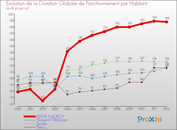 Dans le même temps, la Dotation Globale de Fonctionnement accordée aux communes françaises similaires à Beine-Nauroy était de 214 € par habitant, en 2012.