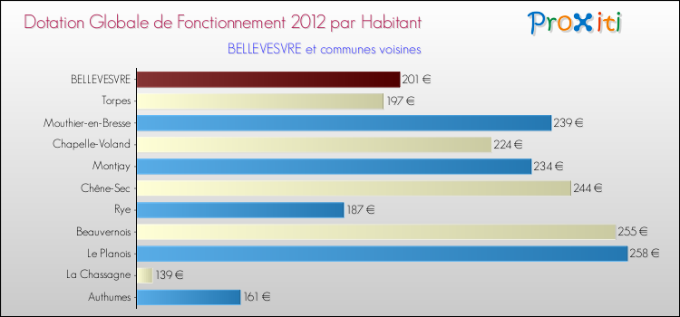 Le graphique ci dessous indique la Dotation Globale de Fonctionnement accordée par habitant à Bellevesvre en 2012 par rapport aux communes voisines.