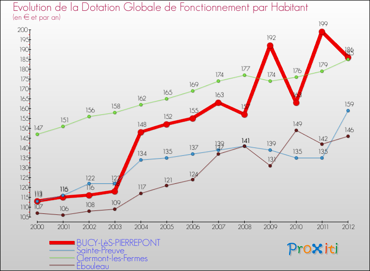 Dans le même temps, la Dotation Globale de Fonctionnement accordée aux communes françaises similaires à Bucy-lès-Pierrepont était de 200 € par habitant, en 2012.