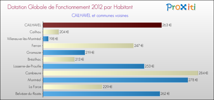 Le graphique ci dessous indique la Dotation Globale de Fonctionnement accordée par habitant à Cailhavel en 2012 par rapport aux communes voisines.