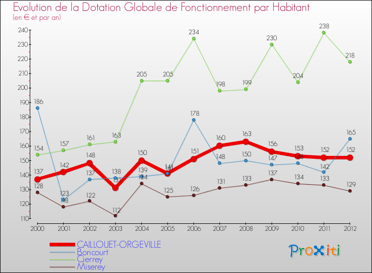 Dans le même temps, la Dotation Globale de Fonctionnement accordée aux communes françaises similaires à Caillouet-Orgeville était de 181 € par habitant, en 2012.