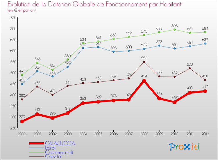 Le graphique ci dessous indique la Dotation Globale de Fonctionnement accordée par habitant à Calacuccia en 2012 par rapport aux communes voisines.