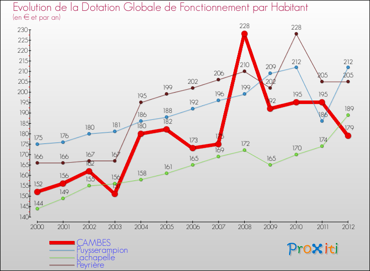 Dans le même temps, la Dotation Globale de Fonctionnement accordée aux communes françaises similaires à Cambes était de 232 € par habitant, en 2012.