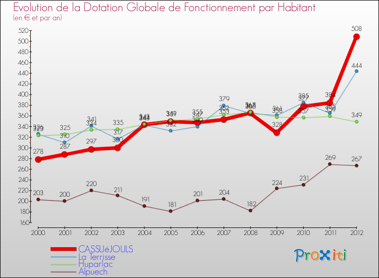 Dans le même temps, la Dotation Globale de Fonctionnement accordée aux communes françaises similaires à Cassuéjouls était de 228 € par habitant, en 2012.