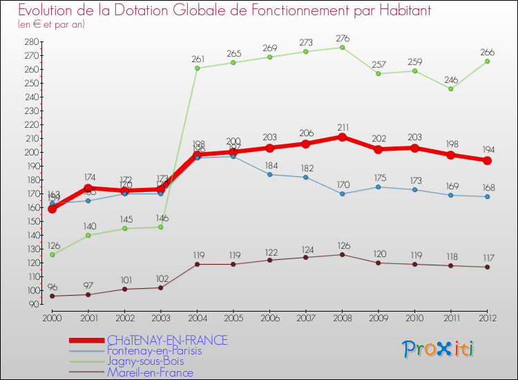 Dans le même temps, la Dotation Globale de Fonctionnement accordée aux communes françaises similaires à Châtenay-en-France était de 232 € par habitant, en 2012.