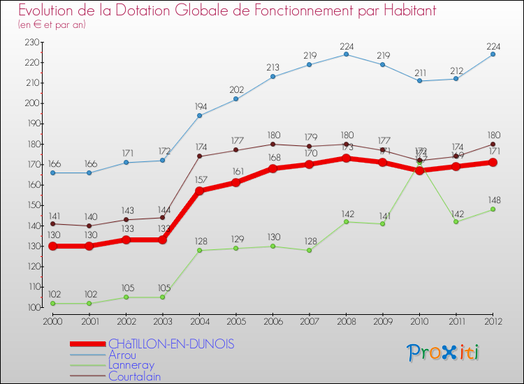 Dans le même temps, la Dotation Globale de Fonctionnement accordée aux communes françaises similaires à Châtillon-en-Dunois était de 173 € par habitant, en 2012.