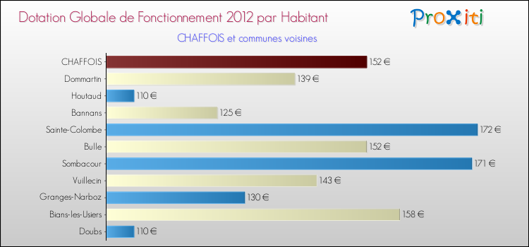 Le graphique ci dessous indique la Dotation Globale de Fonctionnement accordée par habitant à Chaffois en 2012 par rapport aux communes voisines.