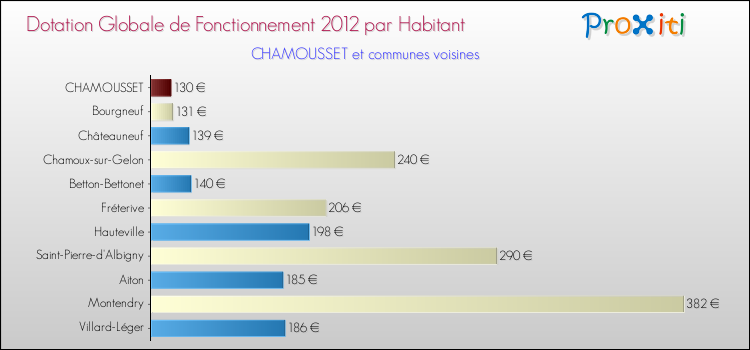 Le graphique ci dessous indique la Dotation Globale de Fonctionnement accordée par habitant à Chamousset en 2012 par rapport aux communes voisines.