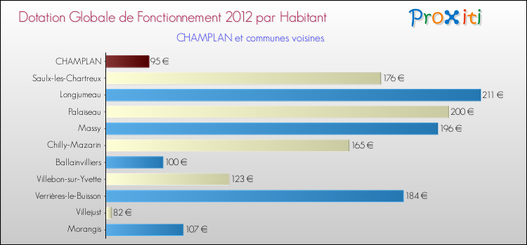Dans le même temps, la Dotation Globale de Fonctionnement accordée aux communes françaises similaires à Champlan était de 183 € par habitant, en 2012.