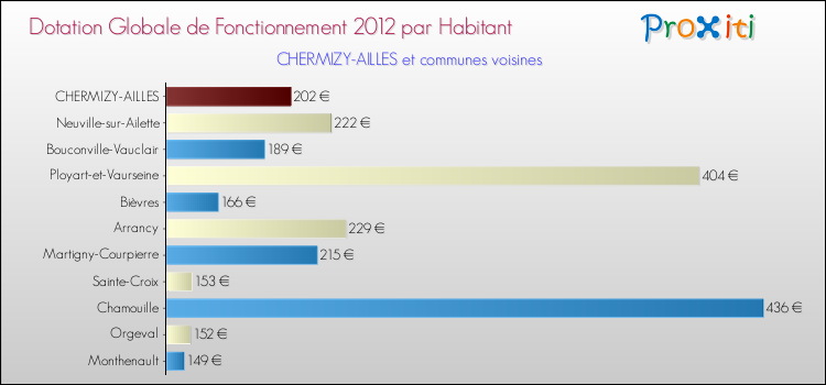 Le graphique ci dessous indique la Dotation Globale de Fonctionnement accordée par habitant à Chermizy-Ailles en 2012 par rapport aux communes voisines.