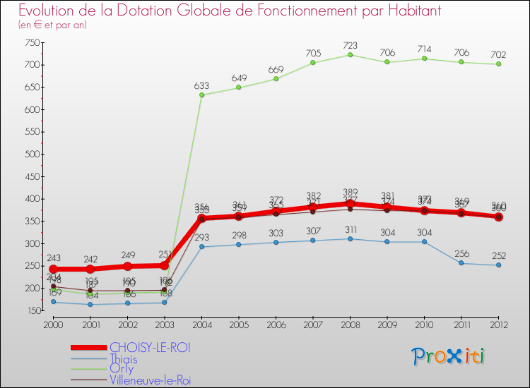 Dans le même temps, la Dotation Globale de Fonctionnement accordée aux communes françaises similaires à Choisy-le-Roi était de 351 € par habitant, en 2012.