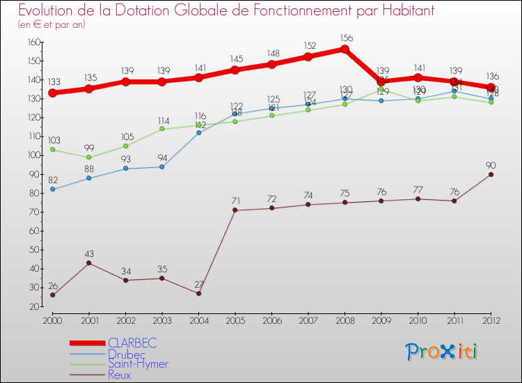 Dans le même temps, la Dotation Globale de Fonctionnement accordée aux communes françaises similaires à Clarbec était de 181 € par habitant, en 2012.