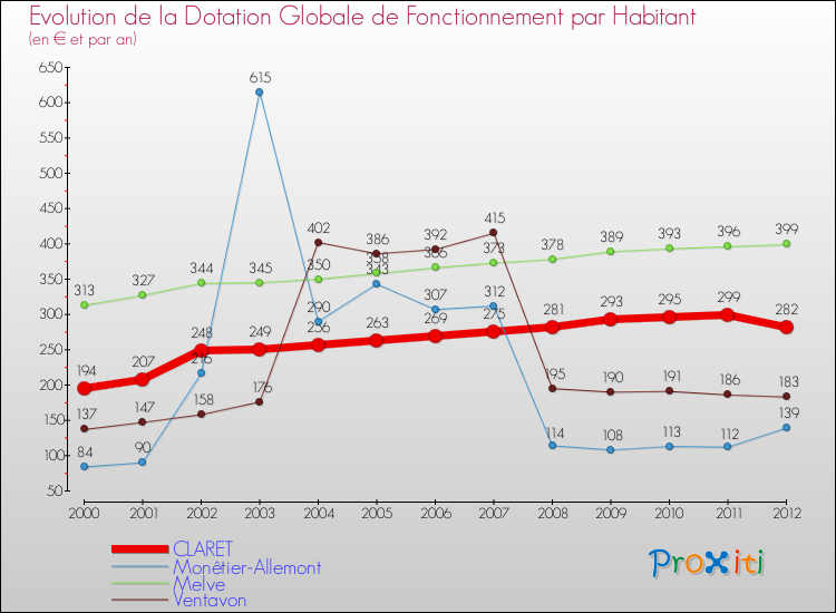 Dans le même temps, la Dotation Globale de Fonctionnement accordée aux communes françaises similaires à Claret était de 232 € par habitant, en 2012.