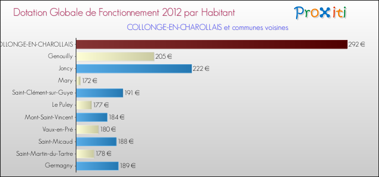 Le graphique ci dessous indique la Dotation Globale de Fonctionnement accordée par habitant à Collonge-en-Charollais en 2012 par rapport aux communes voisines.