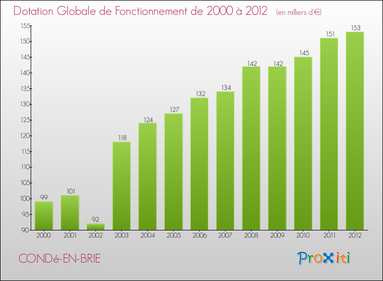 Dans le même temps, la Dotation Globale de Fonctionnement accordée aux communes françaises similaires à Condé-en-Brie était de 214 € par habitant, en 2012.