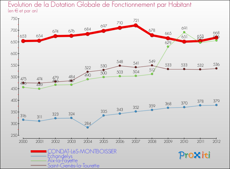 Le graphique ci dessous indique la Dotation Globale de Fonctionnement accordée par habitant à Condat-lès-Montboissier en 2012 par rapport aux communes voisines.