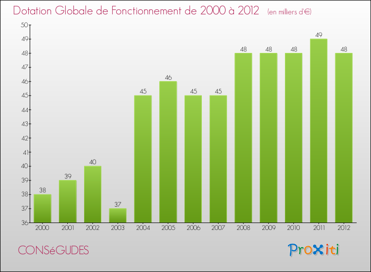 C'est la DGF (Dotation Globale de Fonctionnement) par laquelle l'état redonne une part de son budget aux communes, qui a constitué le principal revenu de Conségudes en 2012.