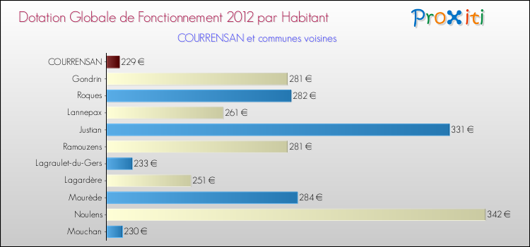 Le graphique ci dessous indique la Dotation Globale de Fonctionnement accordée par habitant à Courrensan en 2012 par rapport aux communes voisines.