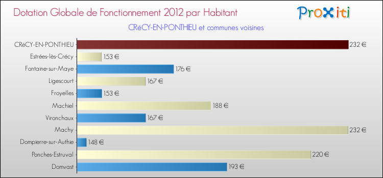 Le graphique ci dessous indique la Dotation Globale de Fonctionnement accordée par habitant à Crécy-en-Ponthieu en 2012 par rapport aux communes voisines.