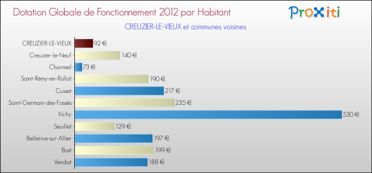Le graphique ci dessous indique la Dotation Globale de Fonctionnement accordée par habitant à Creuzier-le-Vieux en 2012 par rapport aux communes voisines.