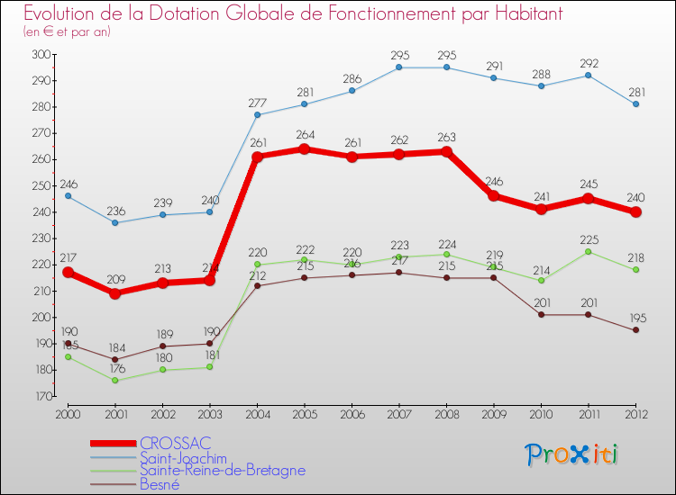 Dans le même temps, la Dotation Globale de Fonctionnement accordée aux communes françaises similaires à Crossac était de 183 € par habitant, en 2012.