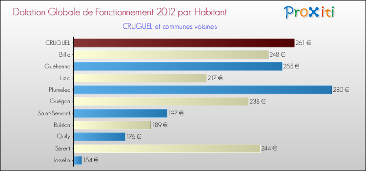 Le graphique ci dessous indique la Dotation Globale de Fonctionnement accordée par habitant à Cruguel en 2012 par rapport aux communes voisines.