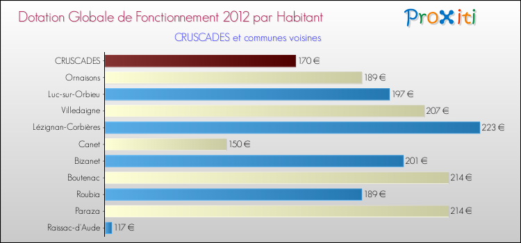 Le graphique ci dessous indique la Dotation Globale de Fonctionnement accordée par habitant à Cruscades en 2012 par rapport aux communes voisines.