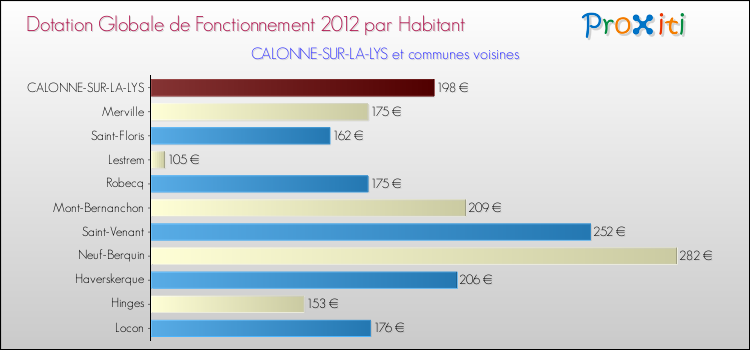 Le graphique ci dessous indique la Dotation Globale de Fonctionnement accordée par habitant à Calonne-sur-la-Lys en 2012 par rapport aux communes voisines.