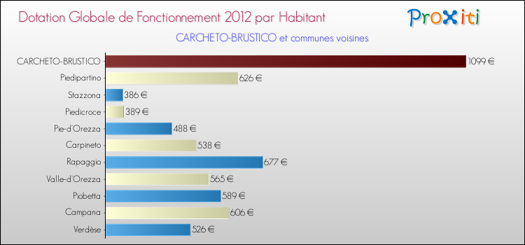 Le graphique ci dessous indique la Dotation Globale de Fonctionnement accordée par habitant à Carcheto-Brustico en 2012 par rapport aux communes voisines.