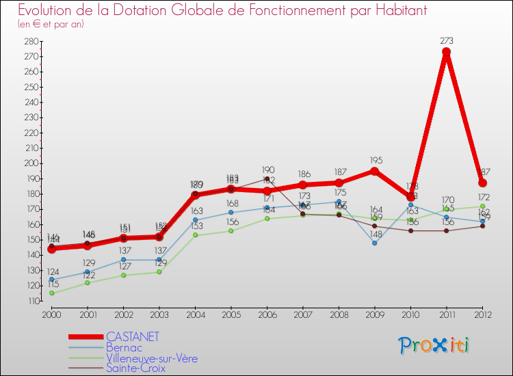 Dans le même temps, la Dotation Globale de Fonctionnement accordée aux communes françaises similaires à Castanet était de 228 € par habitant, en 2012.