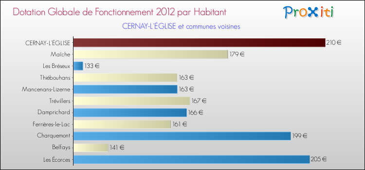 Le graphique ci dessous indique la Dotation Globale de Fonctionnement accordée par habitant à Cernay-l'Église en 2012 par rapport aux communes voisines.