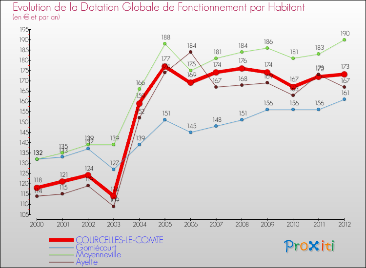 Dans le même temps, la Dotation Globale de Fonctionnement accordée aux communes françaises similaires à Courcelles-le-Comte était de 181 € par habitant, en 2012.
