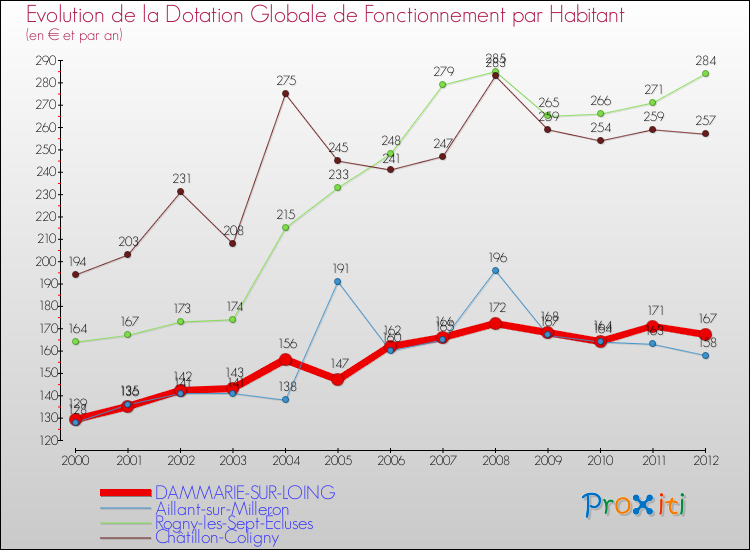 Dans le même temps, la Dotation Globale de Fonctionnement accordée aux communes françaises similaires à Dammarie-sur-Loing était de 173 € par habitant, en 2012.
