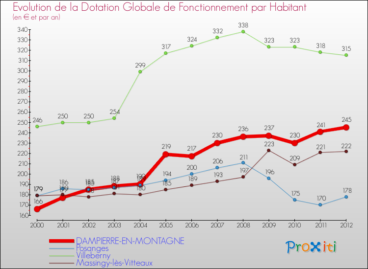 Dans le même temps, la Dotation Globale de Fonctionnement accordée aux communes françaises similaires à Dampierre-en-Montagne était de 232 € par habitant, en 2012.