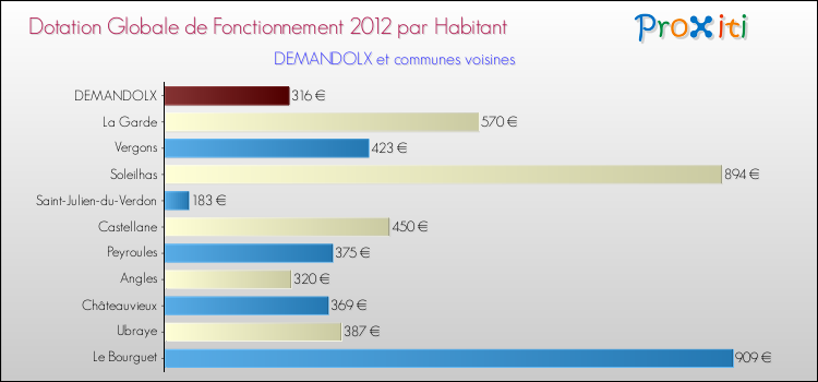 Le graphique ci dessous indique la Dotation Globale de Fonctionnement accordée par habitant à Demandolx en 2012 par rapport aux communes voisines.