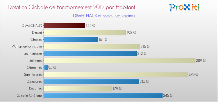 Le graphique ci dessous indique la Dotation Globale de Fonctionnement accordée par habitant à Dimechaux en 2012 par rapport aux communes voisines.