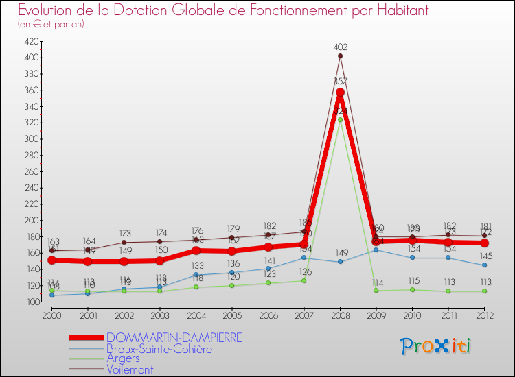 Le graphique ci dessous indique la Dotation Globale de Fonctionnement accordée par habitant à Dommartin-Dampierre en 2012 par rapport aux communes voisines.