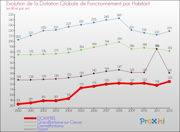 Dans le même temps, la Dotation Globale de Fonctionnement accordée aux communes françaises similaires à Domprel était de 232 € par habitant, en 2012.