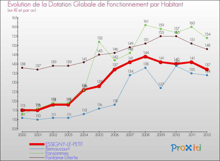 Dans le même temps, la Dotation Globale de Fonctionnement accordée aux communes françaises similaires à Essigny-le-Petit était de 181 € par habitant, en 2012.