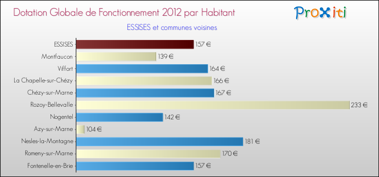 Le graphique ci dessous indique la Dotation Globale de Fonctionnement accordée par habitant à Essises en 2012 par rapport aux communes voisines.
